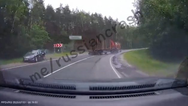 交通事故 [動画0:27] 木材トラック、絶対避けられない不意打ちを食らわせる