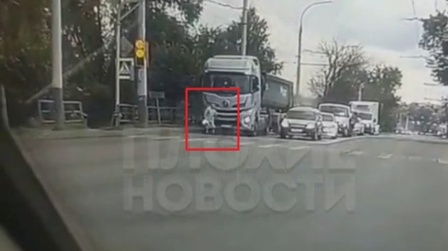 交通事故 [動画0:27] 歩道に立っていた女性、勢いよくトラックに倒される