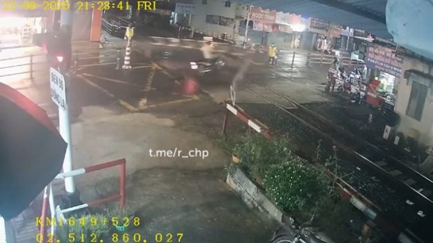 交通事故 [動画0:44] 止めたのに・・・、遮断機のない踏切に突っ込むライダーさん
